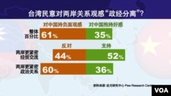 报告中另一外有趣的现象是,尽管超过六成台湾民众对中国持负面态度,但谈到经贸交流,仍有一半的台湾民众说他们支持更紧密的两岸经贸关系。被问到为什么会有这种“政经分离”的差异?谭妲表示:台湾民众支持强化与美国的经贸交流以及政治关系,但另一方面,只有非常少数的台湾民众希望和中国在政治上有更紧密的关系,虽然也有一些人支持与中国发展更紧密的经贸关系,这样的人在台湾实际上大概有将近53%左右,所以台湾民众在看待与美中两国的关系时,似乎还是将经济的因素考虑在内。谭妲进一步指出:“52%的台湾民众支持两岸加强经贸交流,36%的台湾民众支持与中国发展政治关系,我们在这中间的确看到“政经分离”的倾向,但这份问卷中许多问题的差别,都还可以再细分出政党倾向、国族认同以及不同年龄层之间的差距,我再提一下刚刚说过的国族认同,如果将认为自己单纯是台湾人的,和认为自己台湾人、中国人两者皆是的人相比,认为自己是台湾人的对中国普遍持负面观感。在认为自己是台湾人的族群当中的确也有支持两岸经贸往来的,这比他们支持发展两岸政治关系的要多一些,但和其他认为自己两者皆是的人相比,支持两岸经贸交流度的比例仍然偏低,只有37%,因此从不同的族群来看的确是有差别,但在认为自己是台湾人的族群中,仍然是非常低。 “