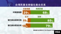 美国知名民调研究机构“皮尤研究中心”(Pew Research Center)5月12日公布一份调查台湾民众对美中两国态度的报告。这是"皮尤研究中心"首次针对台湾民意进行调查。结果显示,台湾民众对美国的好感度是对中国好感度的两倍,对美中两国持正面观感的受访者比例分别是六成八和三成五,此外也有超过六成的台湾受访者对中国持负面观感。