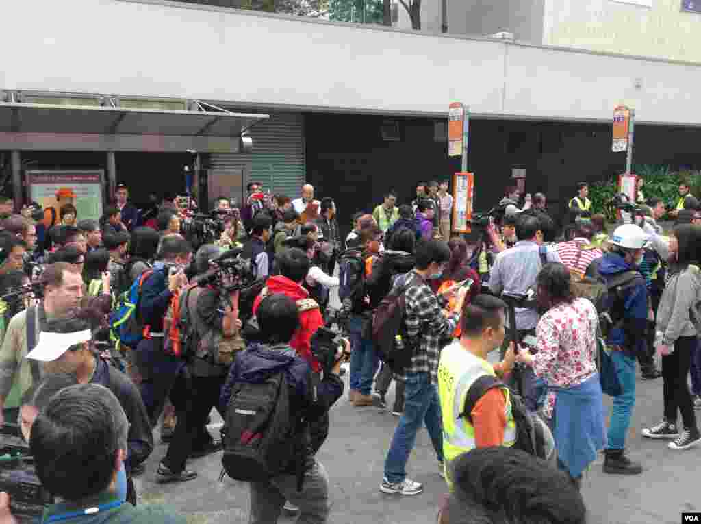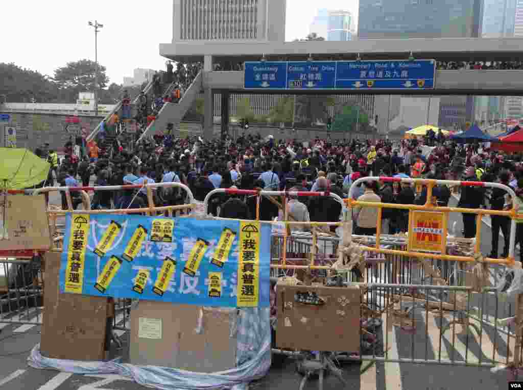 香港争取真普选的占领运动12月11日踏入第75天,这一天也是外界广泛关注的香港警方对金钟占领区展开全面清场的日子。在港府和警方呼吁占领者尽快离开,市民星期四尽量避免前往占领区的同时,上万市民星期三晚云集金钟,希望见证历史,而学联、学民思潮及多位泛民议员都通宵留守。 请看美国之音记者海彦在现场拍摄的照片。