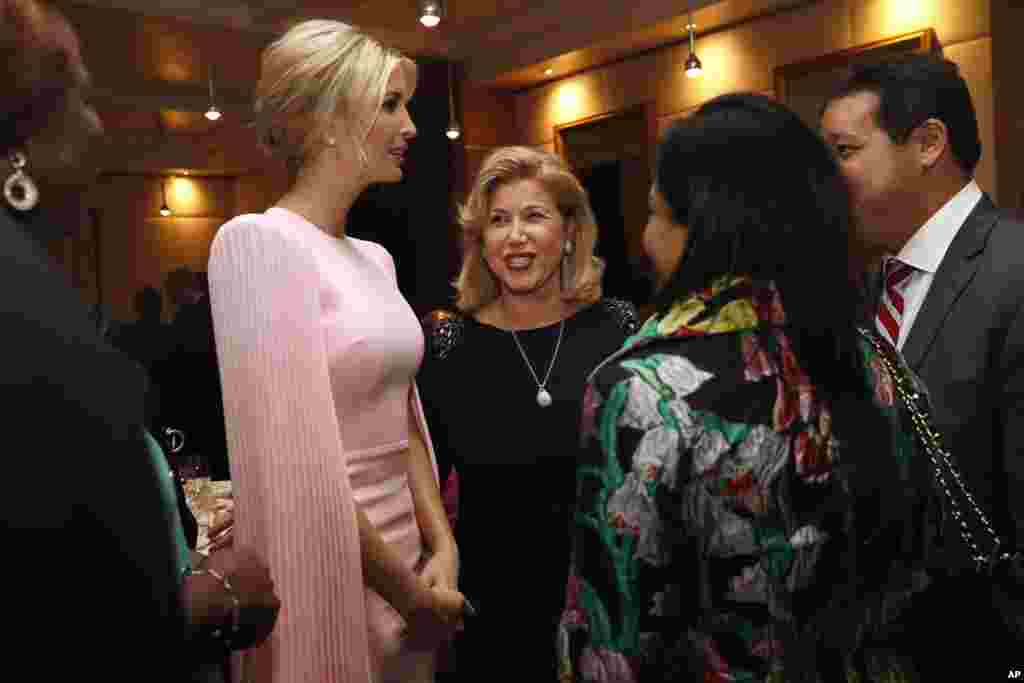 在参加女性企业家融资倡议峰会之后,在科特迪瓦总统举行的国宴上,美国白宫高级顾问伊万卡·特朗普2019年4月17日在科特迪瓦阿比让同科特迪瓦总统夫人等人交谈。
