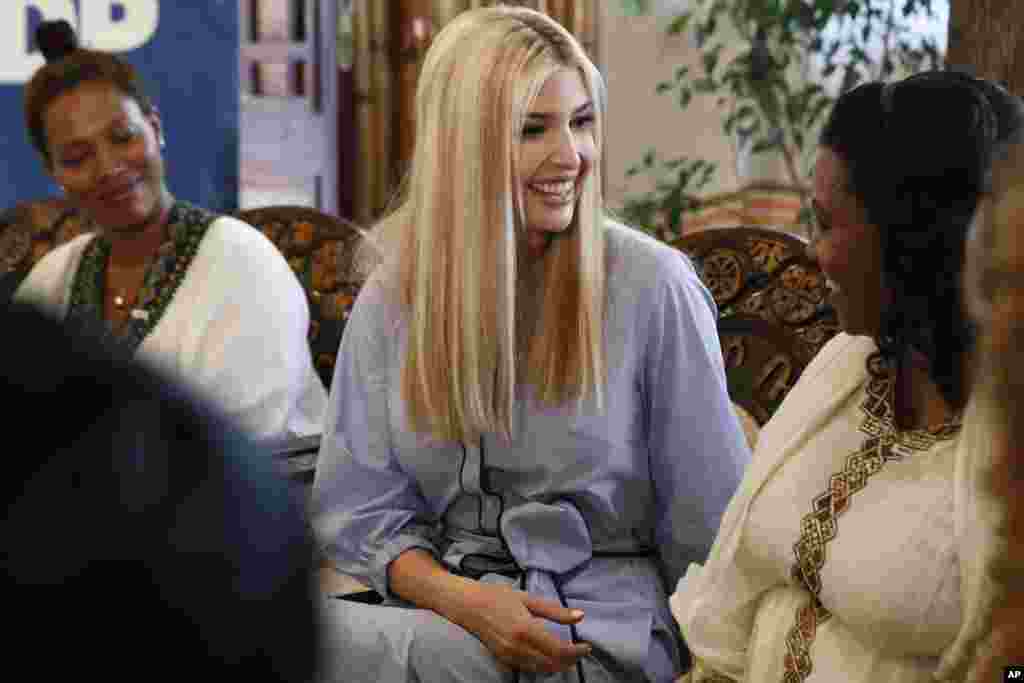 白宫顾问伊万卡·特朗普在埃塞俄比亚的亚的斯亚贝巴同接受美国援助贷款的当地女子交谈。